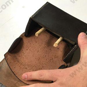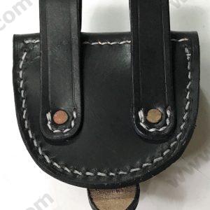 The M1876 McKeever Box is used with the 45/70 rifle or carbine during the Indian Wars. It is made of high quality black leather with a US in oval embossed on the flap. The flap closure has a brass finial. There are two belt loops on the back. Inside are 2 rows of ten canvas loops for 20 cartridges. The box opens by folding down on a brass hinge. The box is available in Black or Russet leather.