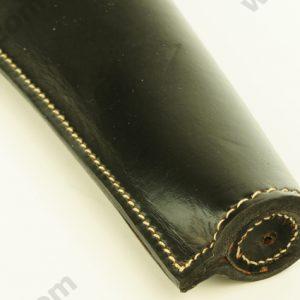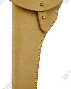 The Indian War “Cavalry” Pistol Holster has a smaller flap than the Civil War model. This Pistol Holster is made of high quality leather embossed with “US” on the holster body. The holster is sewn with white linen thread. The closed flap is secured with a brass finial. The belt loop is stitched and riveted. The holster has a closed bottom. Available in black leather only.