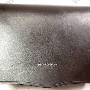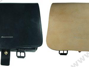 An economical cavalry carbine cartridge box features an inner flap covering a tool pouch. Wooden blocks for cartridges are included. The tab on the front flap is both sewn and riveted. There are 2 belt loops on the back. The box is sewn in white thread and is made of black leather and now in Russet.