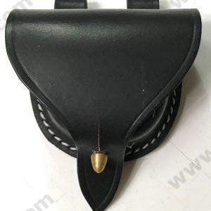 New reproduction percussion cap pouch.Shield shape. Made of black leather and lined with wool. Fits belts up to 2-3/4″ wide893