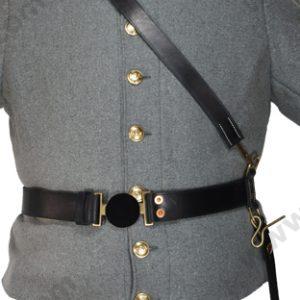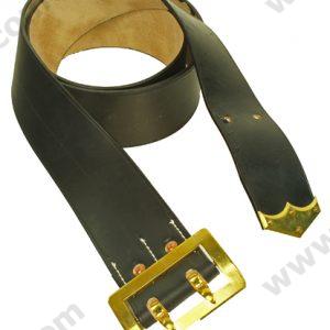 M1855 US issue belt with Brass Keeper installed. The brass keepers were commonly utilized on mid to late war M1855 Enlisted waist belts for Federals. They began to appear by early 1863 to replace the leather loop keeper that had been the standard prior to the war. The keeper has prongs to fasten to the leather waist belt. This belt fits all the one piece buckles and belt plates. Select Black or Russet leather color.