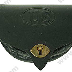 This is the Indian Wars pistol cartridge pouch for the M1873. Nearly identical to the American Civil War Cap Box, except with US in oval embossed on the flap. This economical cap box features an interior lining, brass finial, 2 belt loops on the back and is sewn in white thread.