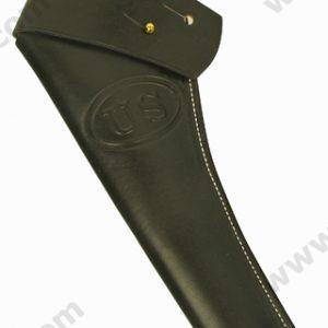 This economical and authentically made Pistol Holster fits most .36 – .44 caliber revolvers. The holster features full wrap around flap that is both stitched and riveted. The closed flap is secured with a brass finial. The belt loop is stitched and riveted. The holster has a CLOSED bottom. Available in Black or Russet leather.