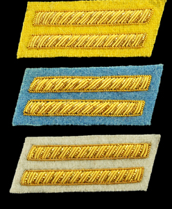 1/2 inch tape applied over wool background. Tape color designates Branch of Service: Infantry: Sky Blue; Artillery: Red; Cavalry: Yellow. Background color should be the color of the coat.