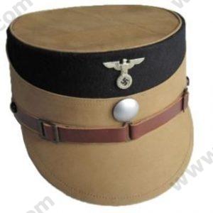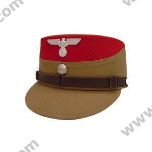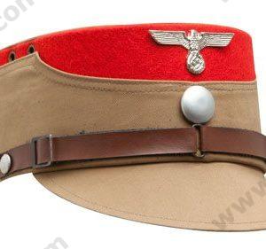 SA Kepi in tan with red top. Complete with brown leather chin strap, pebbled buttons and metal eagle.