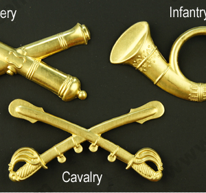 The M1851 Enlisted Hat Insignia is appropriate for both US and CS Enlisted Artillery, Cavalry, and Infantry troops and was used until 1872. It is made of stamped brass from the original dies and has a wire back for attaching to the hat. The insignia is about 3 1/2 inches wide and 2 inches high.